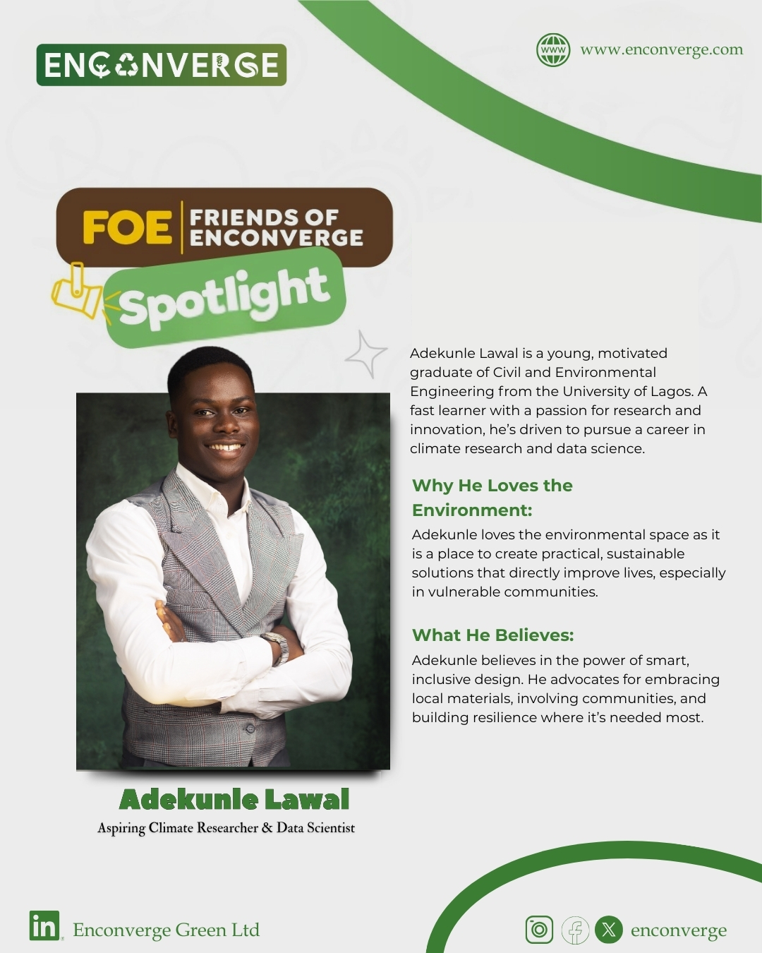 To him, the environment is not a problem but a platform for change. It is a space where science meets community. Adekunle champions locally sourced solutions and inclusive development. He believes sustainability must start where people live, work, and dream.