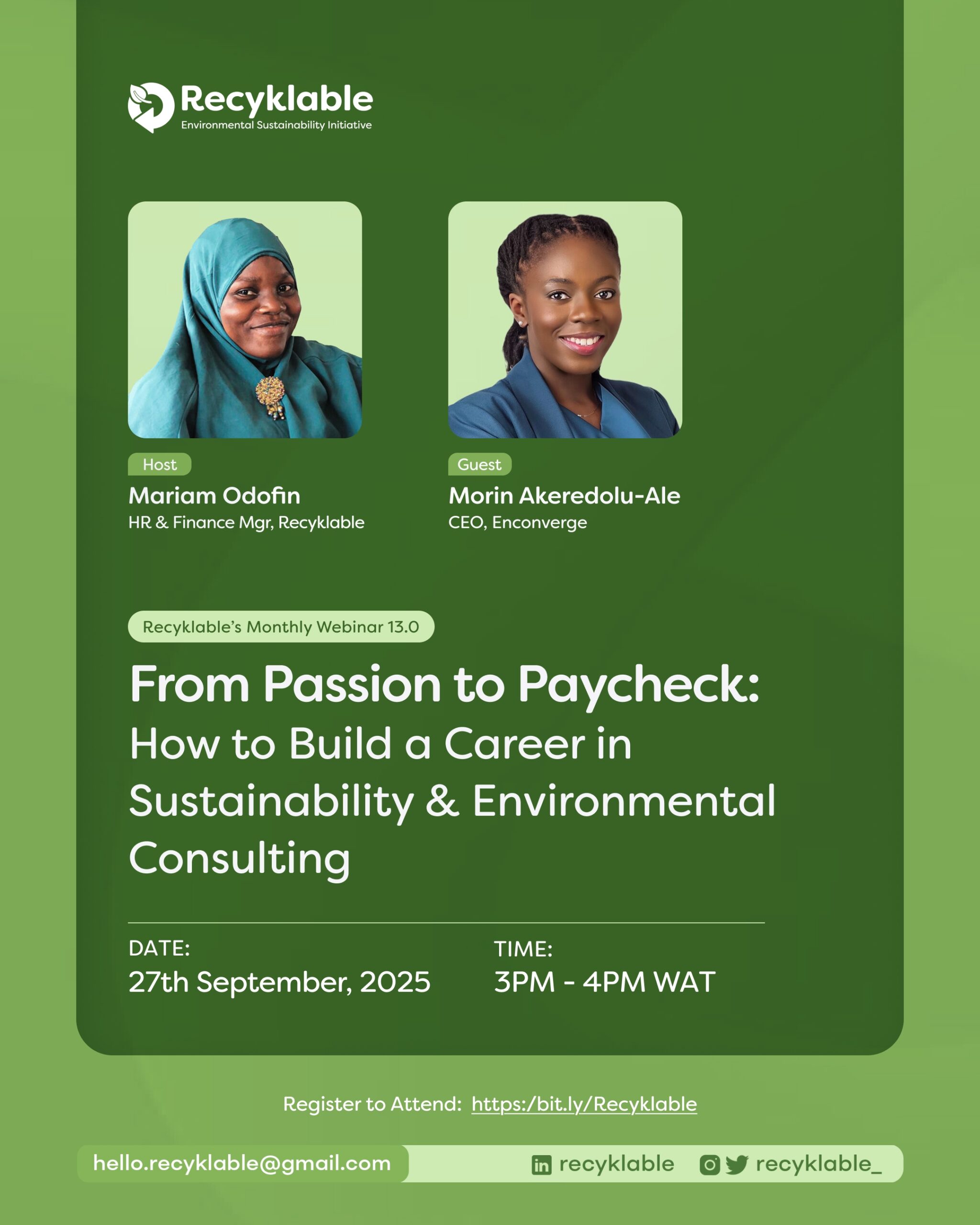 Author: Temitope AwolusiEditor: Morin Akeredolu-Ale“…success is fleeting, but impact lasts!”On Saturday, 27 September 2025, the CEO of Enconverge Green Ltd., Morin Akeredolu-Ale, was hosted on a webinar by Recyklable Sustainability Initiative where she delivered an inspiring presentation titled “From Passion to Paycheck: How to Build a Career in Sustainability and Environmental Consulting.”The session was a...